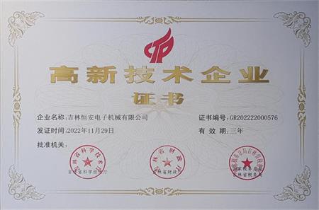 熱烈祝賀:吉林恒安電子機械有限公司在2022年吉林省科學技術廳高新技術企業評定工作中,榮獲高新技術企業證書。